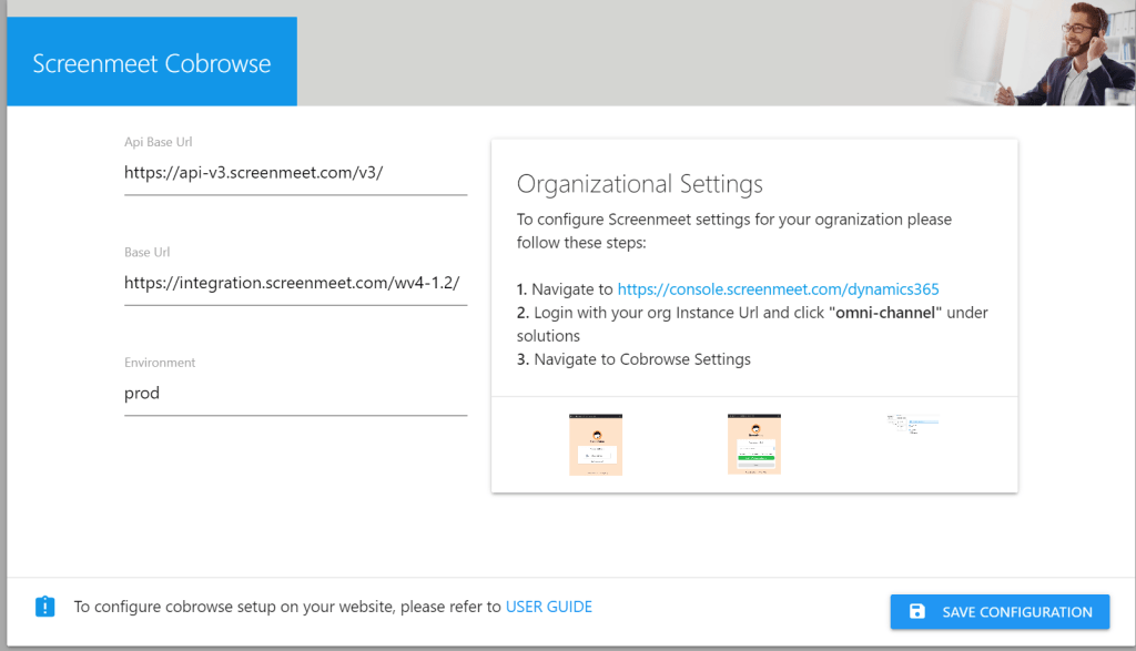 - In the OmniChannel Engagement Hub Admin App, select the configuration option in the Screenmeet Cobrowse section