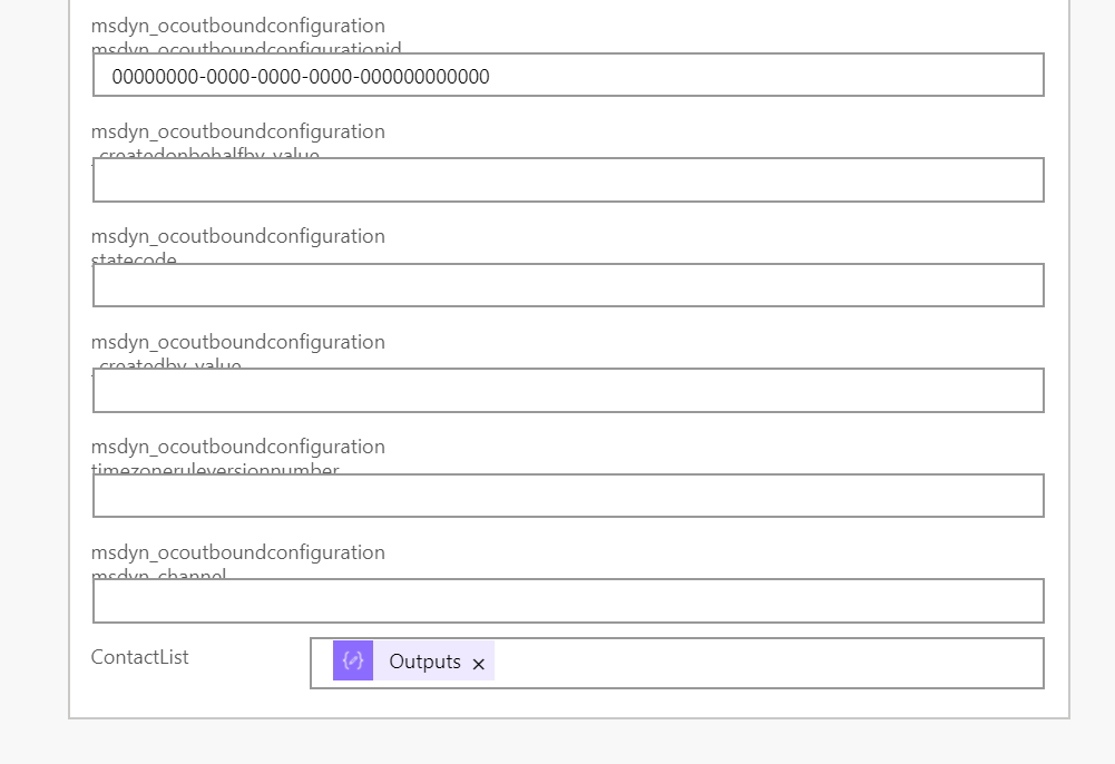 - populate the msdyn_ocoutboundconfiguration msdyn_ocoutboundconfigurationid variable with the configuration id copied from the outbound configuration created earlier.