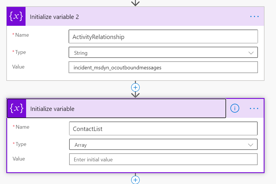 - ActivityRelationship – This variable should be created as a string with the value “incident_msdyn_ocoutboundmessages”